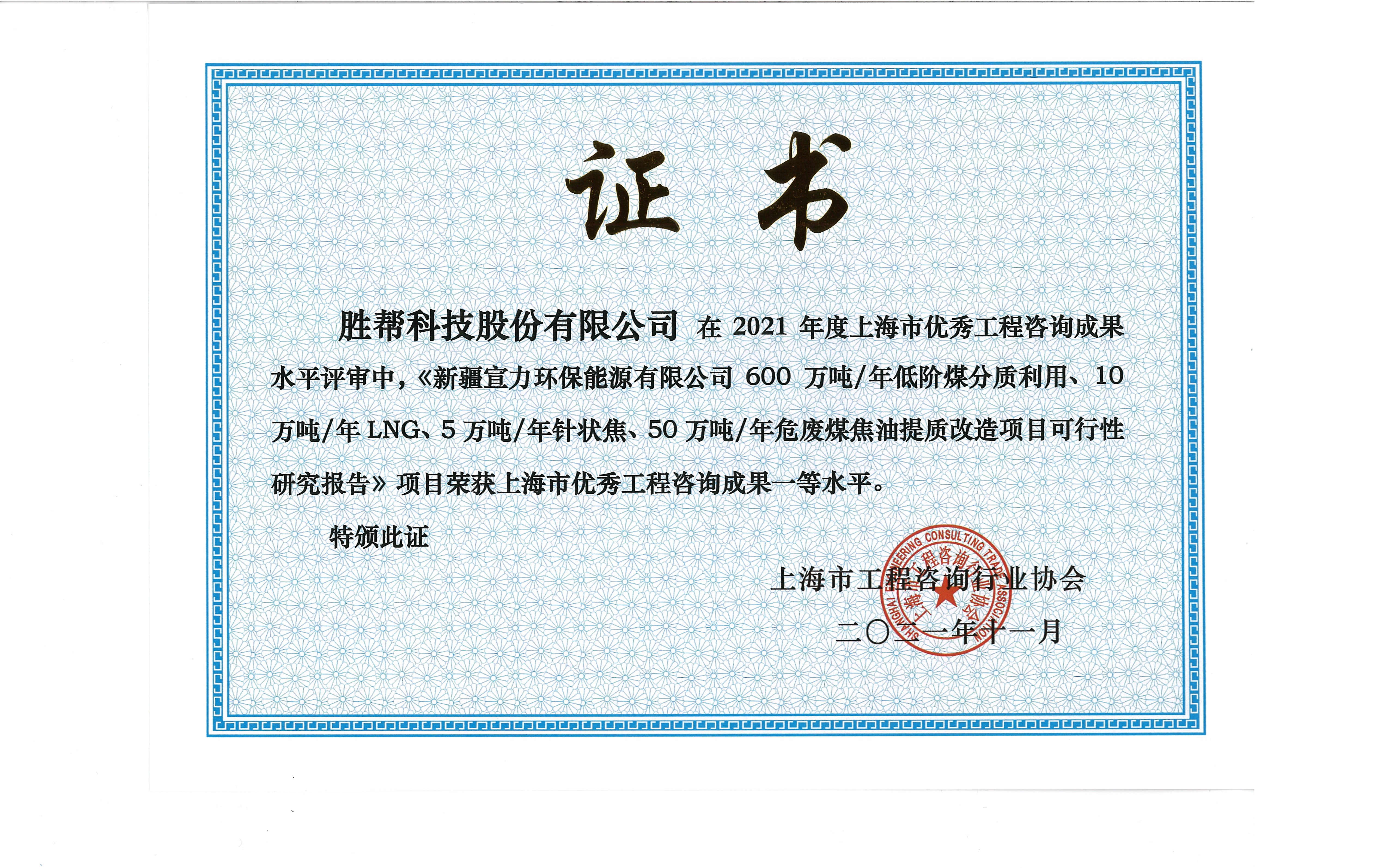 日前從上海市工程咨詢行業(yè)協(xié)會(huì)傳來喜訊,在“2021年度上海市優(yōu)秀工程咨詢成果獎(jiǎng)”評選中,我司編制的《新疆宣力環(huán)保能源有限公司600萬噸/年低階煤分質(zhì)利用、10萬噸/年LNG、5萬噸/年針狀焦、50萬噸/年危廢煤焦油提質(zhì)改造項(xiàng)目可行性研究報(bào)告》榮獲一等獎(jiǎng),《海螺新材料公司年產(chǎn)20萬噸外加劑項(xiàng)目可行性研究報(bào)告》榮獲三等獎(jiǎng)。此次榮譽(yù)的獲得是對我公司在工程咨詢領(lǐng)域業(yè)績的肯定,同…