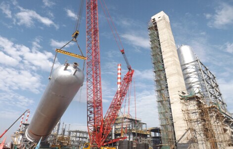 2014年7月15日早上8點(diǎn)整,在陜西東鑫垣勝幫項(xiàng)目現(xiàn)場(chǎng),由大連金州重型機(jī)械有限公司承建制造的焦炭塔進(jìn)行吊裝就位,焦炭塔高位32米,直徑6.1米,總重量為185T,采用了400T的履帶吊作為主吊,300t汽車吊作為溜尾吊車進(jìn)行吊裝,經(jīng)過(guò)近2個(gè)小時(shí)的工作,焦炭塔順利就位。焦炭塔平穩(wěn)起吊 塔體基本吊起,這時(shí)重量的90%由400T履帶吊承擔(dān) 履帶吊進(jìn)行180度轉(zhuǎn)身焦炭塔基本就位