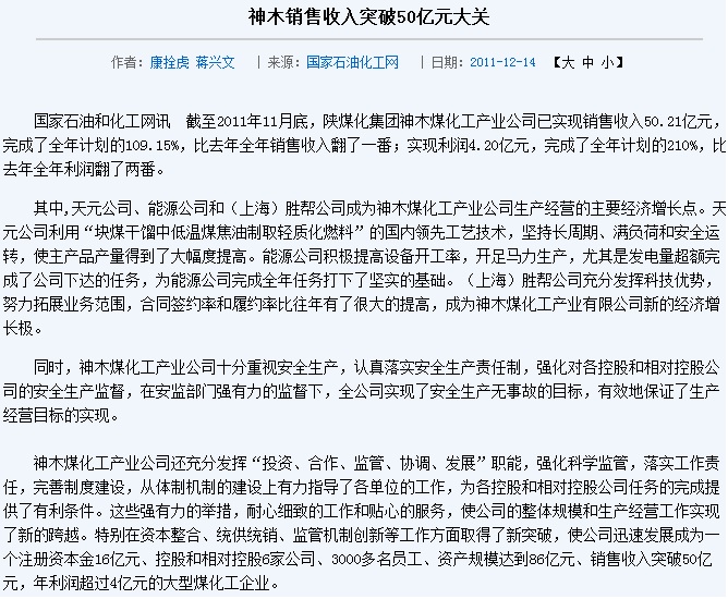 據(jù)國家石油和化工網(wǎng)訊 截止2011年11月底,陜煤化集團神木煤化工產(chǎn)業(yè)公司銷售收入大增。其中,上海勝幫公司充分發(fā)揮科技優(yōu)勢,努力拓展業(yè)務(wù)范圍,合同簽約率和履約率比往年有了很大的提高,成為神木煤化工產(chǎn)業(yè)有限公司新的經(jīng)濟增長極。