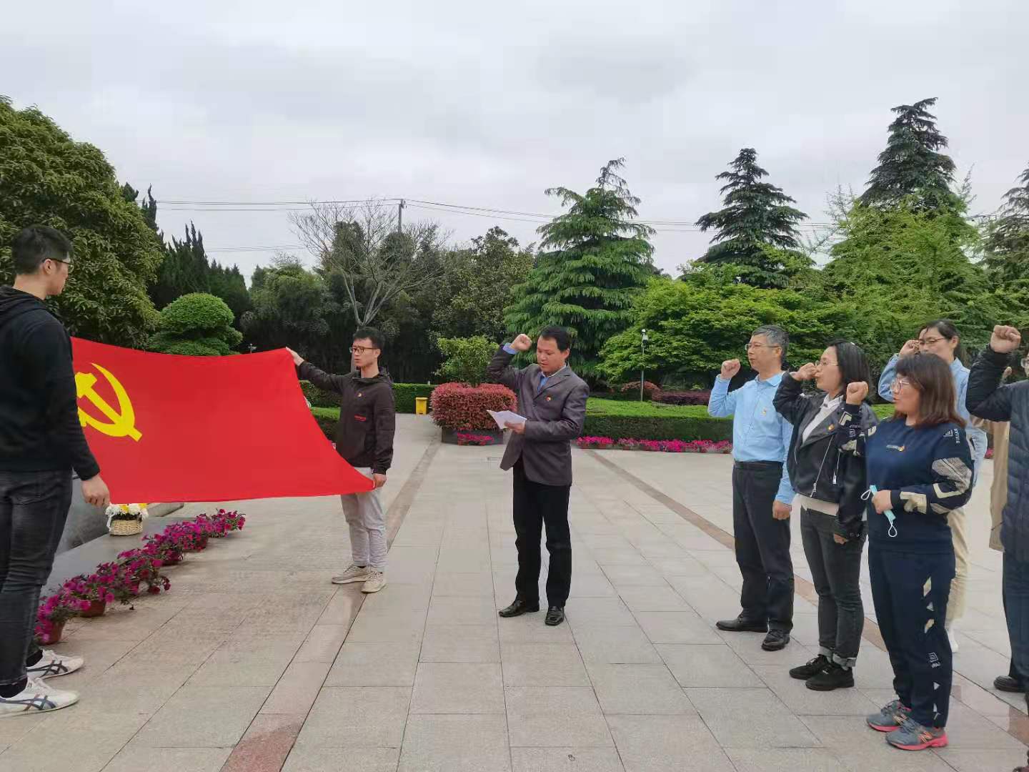 全體黨員在莊嚴的革命烈士紀念碑前肅立,面向黨旗,高舉右手,重溫入黨誓詞,以錚錚誓言表達向革命先烈學習的決心。向烈士紀念碑行三鞠躬禮,表達了對英烈的崇高敬意。