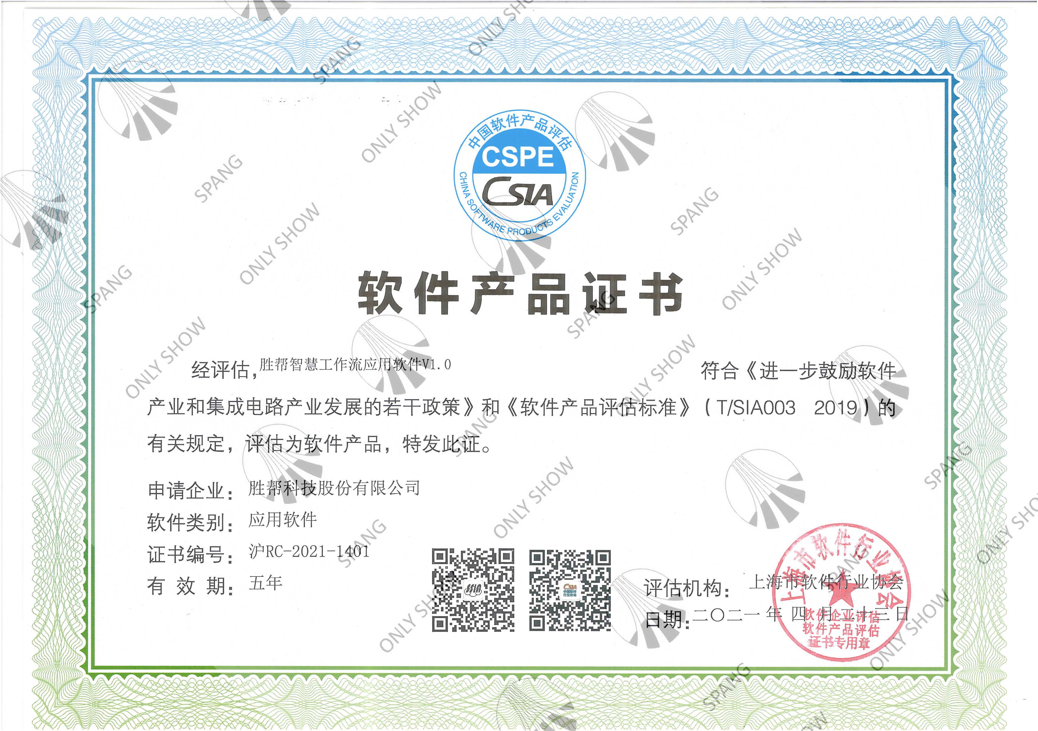 2021年4月23日,經(jīng)上海市軟件行業(yè)協(xié)會(huì)審核,勝幫科技獲得《統(tǒng)一認(rèn)證管理平臺(tái)應(yīng)用軟件》、《智慧安監(jiān)管理系統(tǒng)應(yīng)用軟件》、《智慧工作流應(yīng)用軟件》三項(xiàng)計(jì)算機(jī)軟件產(chǎn)品證書。