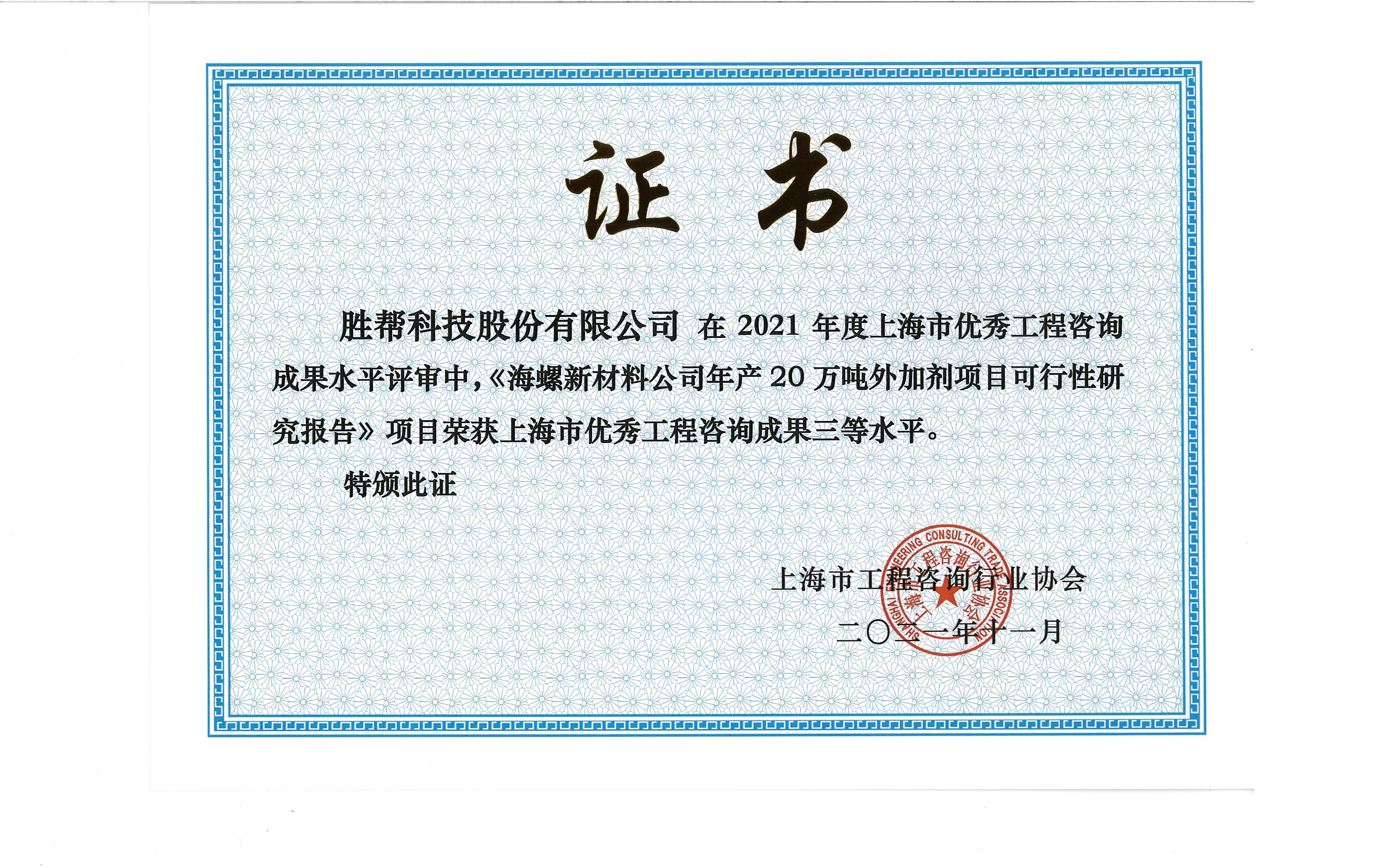 日前從上海市工程咨詢行業(yè)協(xié)會傳來喜訊,在“2021年度上海市優(yōu)秀工程咨詢成果獎”評選中,我司編制的《新疆宣力環(huán)保能源有限公司600萬噸/年低階煤分質(zhì)利用、10萬噸/年LNG、5萬噸/年針狀焦、50萬噸/年危廢煤焦油提質(zhì)改造項目可行性研究報告》榮獲一等獎,《海螺新材料公司年產(chǎn)20萬噸外加劑項目可行性研究報告》榮獲三等獎。