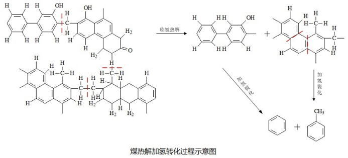 煤氣化的路徑是煤在>1000℃的高溫環(huán)境下,煤中的有機質(zhì)與氣化劑發(fā)生一系列化學反應,將固體煤轉(zhuǎn)化為含有CO、H2、CH4等可燃氣體和CO2、N2等非可燃氣體的合成氣,然后合成氣經(jīng)過一系列反應生成燃料油、芳烴和其他化學品的工藝過程,煤的間接液化、煤制烯烴(甲醇路線)是煤氣化路徑的主要代表。而煤熱解是煤中的有機分子在中低溫條件下(400~600℃)斷裂分解為小分子多環(huán)芳烴,多環(huán)芳烴經(jīng)過簡單的加氫生成燃料油、芳烴和其他化學品的工藝過程。