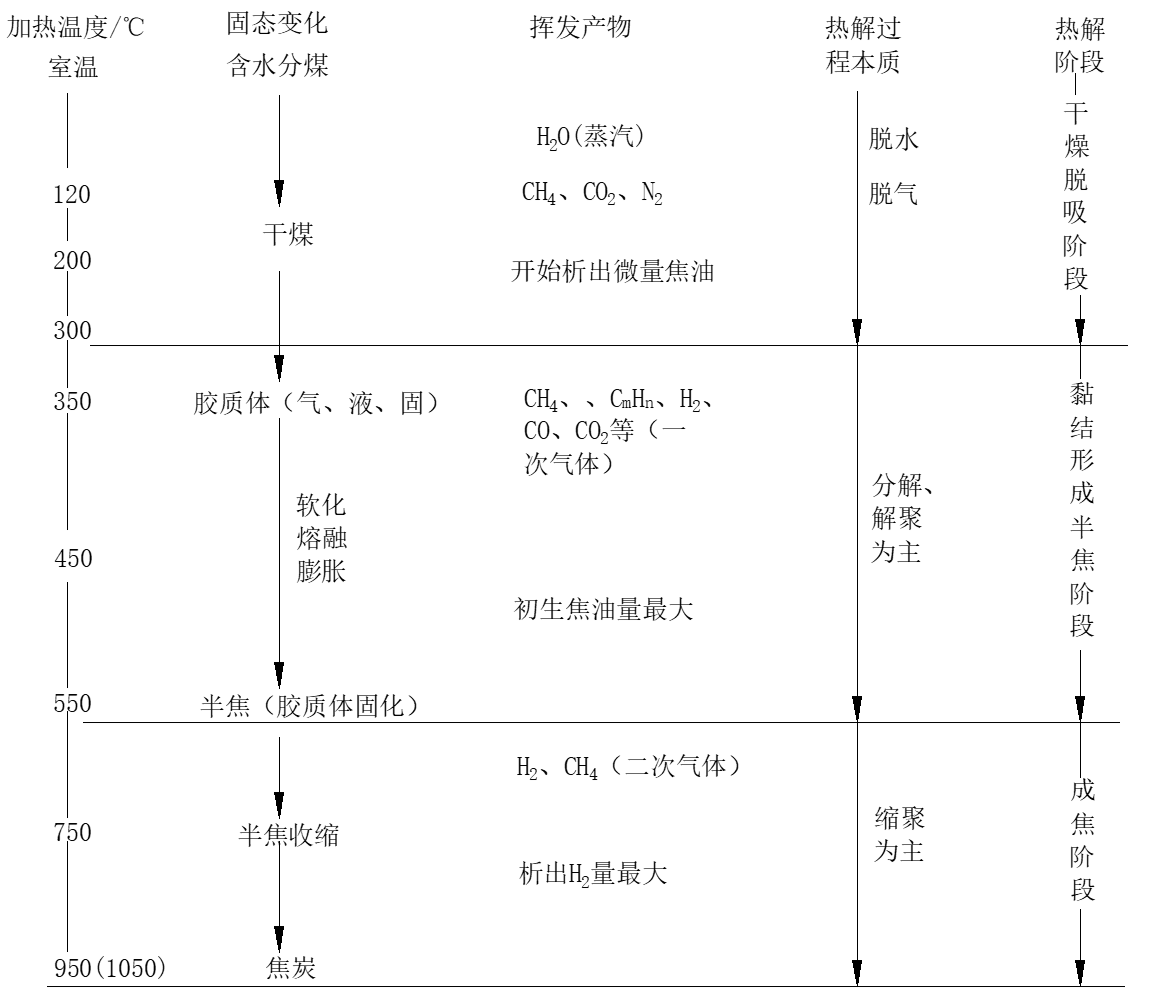 煤是由芳香族、脂肪族、各種官能團和微晶石墨片組成的復雜多相聚合材料。目前人們對煤受熱分解的過程機理認知仍屬于概念性范疇。按熱解最終溫度分為低溫熱解(450~650℃),以制取焦油為目的;中低溫熱解(600~900℃),以生產(chǎn)煤氣為主;中溫熱解(700~900℃),以生產(chǎn)半焦為主;高溫熱解(900~1200℃),即煉焦過程,生產(chǎn)高強度的冶金焦;超高溫熱解(>1200℃)。