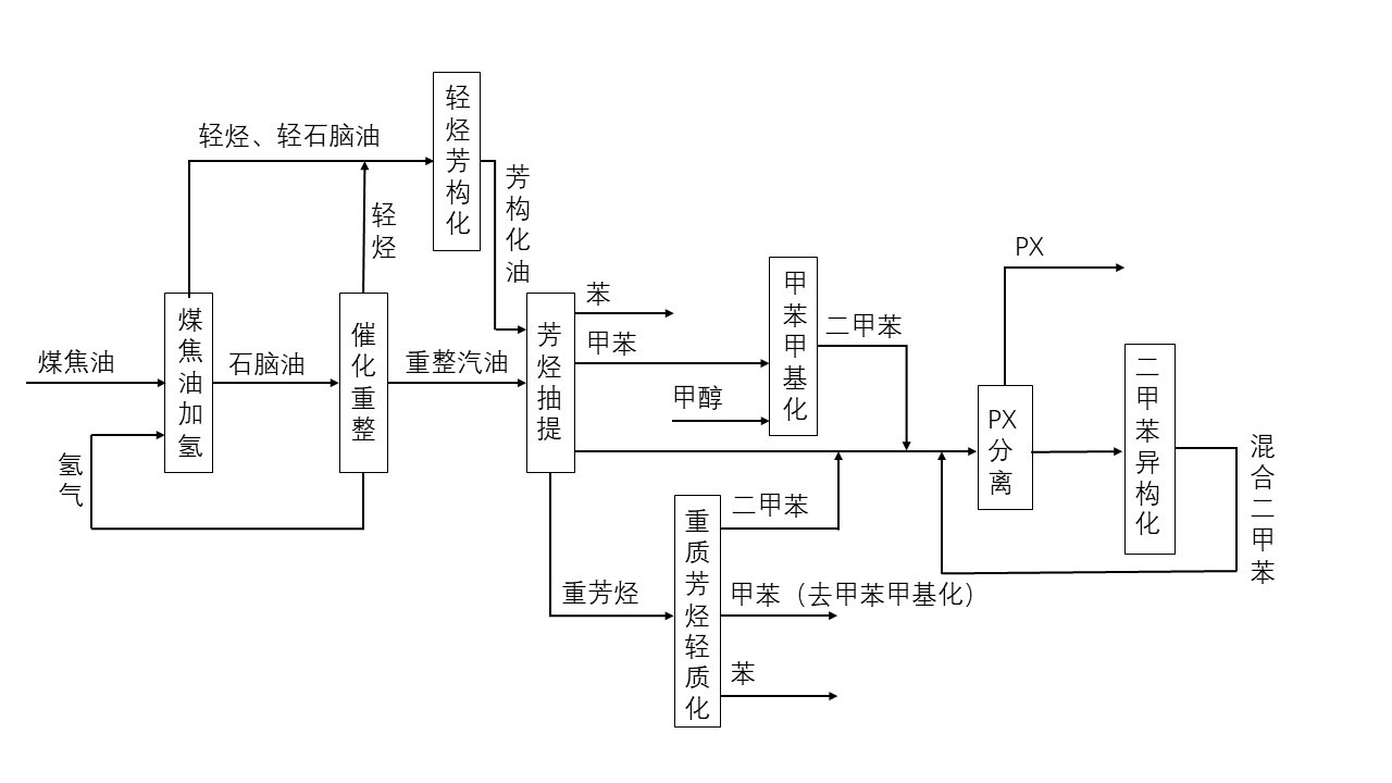 根據(jù)上述流程圖可知,煤焦油經(jīng)加氫得到輕烴、輕石腦油和石腦油,輕烴、輕石腦油進入輕烴芳構(gòu)化單元生產(chǎn)芳構(gòu)化油,石腦油經(jīng)催化重整制得重整汽油;芳構(gòu)化油和重整汽油進入芳烴抽提裝置,經(jīng)分離得到苯、甲苯、二甲苯和重芳烴。甲苯進入甲苯甲基化裝置,與另一原料甲醇反應生成二甲苯;重芳烴進入重芳烴輕質(zhì)化單元,得到苯、甲苯和二甲苯,所得甲苯可用于甲苯甲基化裝置的原料;芳烴制取和芳烴轉(zhuǎn)化過程產(chǎn)生的二甲苯進入PX分離單元,獲得高純度的PX,剩余芳烴經(jīng)二甲苯異構(gòu)化裝置制取混合二甲苯,再循環(huán)回PX分離單元做PX制取的原料。