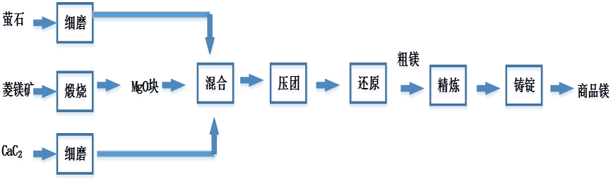 該方法由加拿大科學(xué)家L.M.Pidgeon首先提出。工藝是:將硅鐵(Si > 75 %)和煅燒后的白云石按一定配比混合、磨細(xì)、壓團(tuán),裝入耐熱合金鋼制的還原罐底端密封,在反應(yīng)溫度為1150 ~ 1200 ℃、真空為1.3 ~ 13 Pa的條件下還原出鎂蒸氣,鎂蒸氣冷凝于還原罐另一端,結(jié)晶為粗鎂,再經(jīng)過(guò)精煉澆鑄得到鎂錠。反應(yīng)方程式如下:2(MgO·CaO)(s) + Si(Fe)(s) = 2Mg(g) + 2CaO·Si02(s)。其工藝流程如下圖,還原周期為8 ~ l0 h。