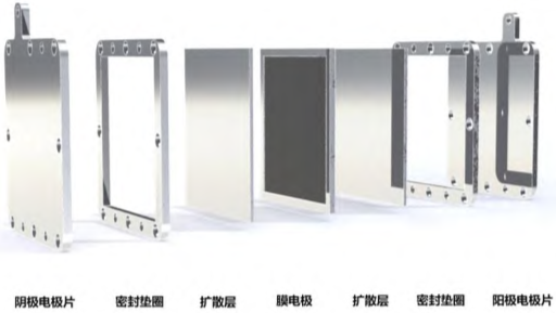 質(zhì)子交換膜電解池主要由質(zhì)子交換膜、催化劑和氣體擴散層組成的膜電極、雙極板和密封圈、防護片、端板等組成,如圖2.3-1所示。