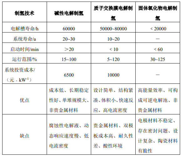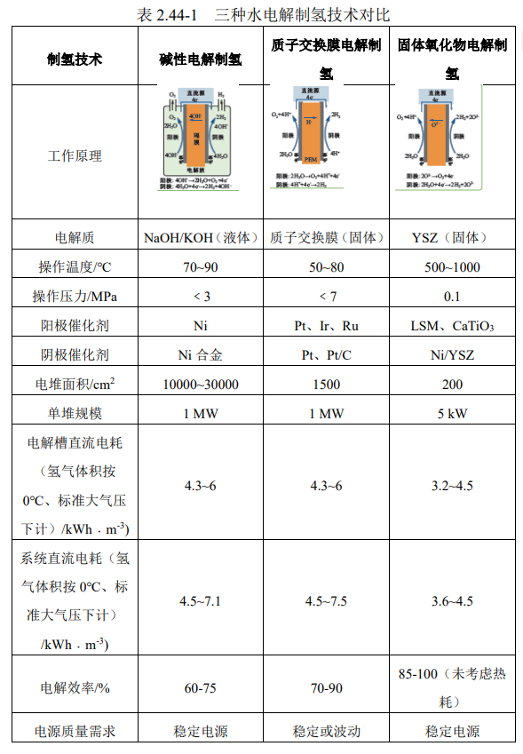 根據(jù)電解液的不同,當前被認為可大規(guī)模推廣的電解制氫技術(shù)主要分為3種:堿性電解、質(zhì)子交換膜電解和固體氧化物電解。表2.4-1是三種水電解制氫技術(shù)對比,表2.4-2為電解水和其它工業(yè)制氫技術(shù)對比。