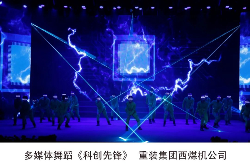 多媒體舞蹈《科創(chuàng)先鋒》,以現(xiàn)代舞和魔術(shù)表演相結(jié)合的藝術(shù)形式,生動展現(xiàn)了趙亦輝及其團隊探索、研發(fā)10米超大采高煤機裝備,將其推向世界的突破,頌揚科技工作者的創(chuàng)新精神與愛國情懷,展示科技創(chuàng)新的力量與魅力。