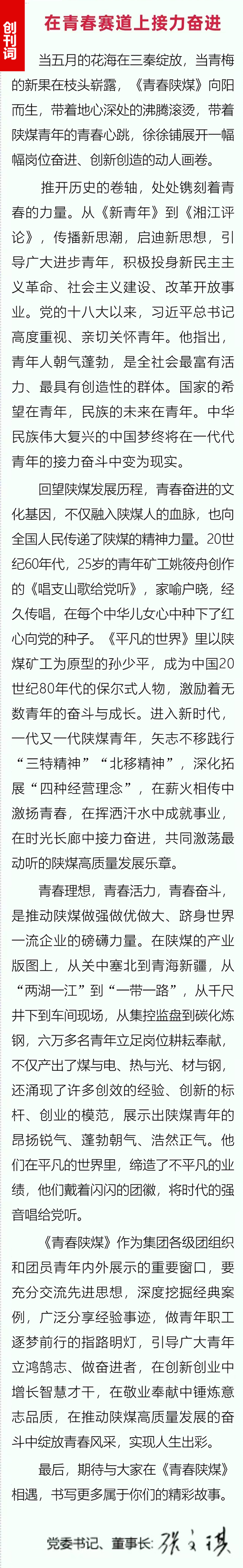 值此“五四”青年節(jié)到來之際,由陜煤集團(tuán)團(tuán)委主辦的以交流提升共青團(tuán)和青年工作為主的實(shí)用性、探索性電子期刊《青春陜煤》正式發(fā)布。陜煤集團(tuán)黨委書記、董事長張文琪發(fā)表了創(chuàng)刊詞,勉勵廣大團(tuán)員青年積極作為、挺膺擔(dān)當(dāng),在青春賽道上接力奮進(jìn)。