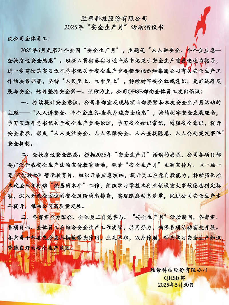 勝幫科技股份有限公司2025年“安全生產(chǎn)月”活動倡議書