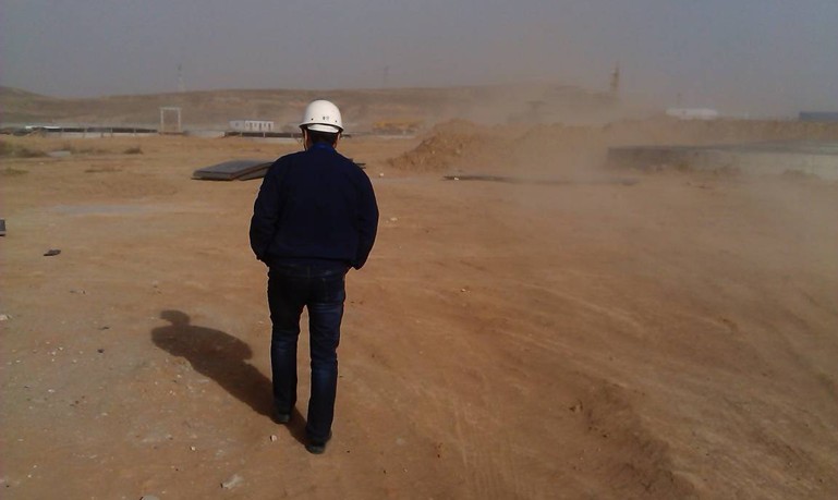 早上來(lái)到工地時(shí),正好遇到每天準(zhǔn)時(shí)到來(lái)的沙塵暴,錢(qián)經(jīng)理不畏-6℃的嚴(yán)寒,風(fēng)沙中行走。