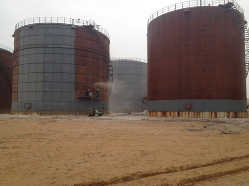 910成品油罐區(qū)噴砂防腐工作火熱進行中