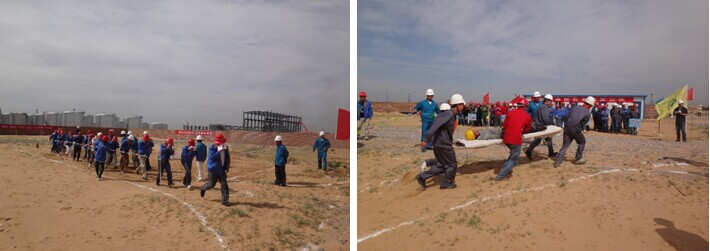 活動(dòng)中由業(yè)主方在指定區(qū)域扮演被困群眾、我總包方扮演救援小組出動(dòng)擔(dān)架搶救傷員、澄合分公司安全員指揮大家應(yīng)急疏散,監(jiān)理單位積極配合,所有“被困群眾”及“傷員”都聽從指揮緊張有序地快速逃離到安全地帶,消防人員用滅火器和消防栓將“大火”熄滅。
