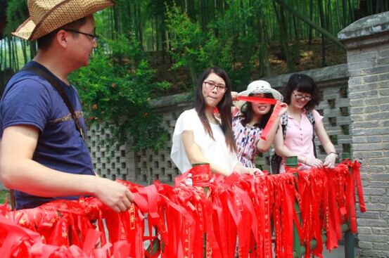 途中經(jīng)過一座寺廟,在這里我們看到了現(xiàn)代交通工具的雛形-獨輪車,感嘆先人們的智慧。今天是父親節(jié),懷著一顆感恩的心,在大師的引導下為父母祈福,愿他們健康長壽。山頂上的竹林迷宮,內(nèi)設十二個生肖亭,亭內(nèi)設名人屬相牌,大家都玩的不亦樂乎。清新的空氣,涓涓的細流,巖石中的樹木……這里的一切讓我們回歸自然,讓我們的心不再浮躁,和自然融為一體。