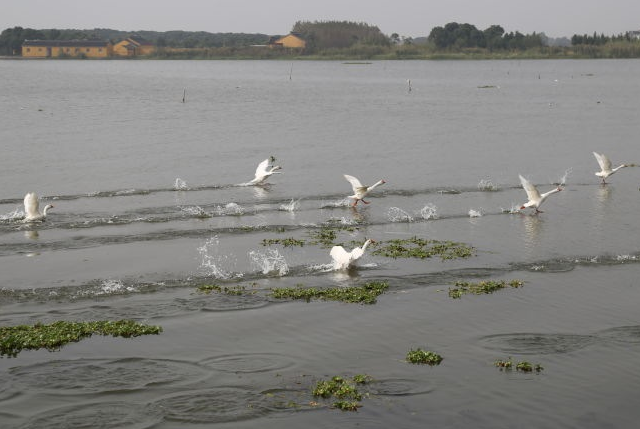 一行共八輛車組成強(qiáng)大陣容,一路浩浩蕩蕩,經(jīng)過(guò)近三個(gè)小時(shí)的長(zhǎng)途跋涉,于上午十一點(diǎn)鐘齊聚陽(yáng)澄湖畔,到達(dá)第一站——阿記蟹舫。那是一幢建在水中的木屋,雖談不上高大上,但也顯得別致。湖面上一群白鵝正在陽(yáng)光下覓食,微風(fēng)劃過(guò),打破湖面的寧?kù)o,泛起層層細(xì)波,驚得那群群白鵝一下子亂作一團(tuán),用力的拍打著水面,沖向岸邊,鬧得水葫蘆也情不自禁跳起了廣場(chǎng)舞。小屋前是排排蟹籠,螃蟹們也不甘寂寞,紛紛爬上籠頂,用蟹鉗敲打著鐵籠,發(fā)出叮叮當(dāng)當(dāng)?shù)穆曇?,仿佛在歡迎我們的到來(lái)。遠(yuǎn)處的風(fēng)車緩緩轉(zhuǎn)動(dòng)將天際切割成一片一片,孩子們?cè)诎渡湘覒虼螋[,好一片熱鬧的景象。