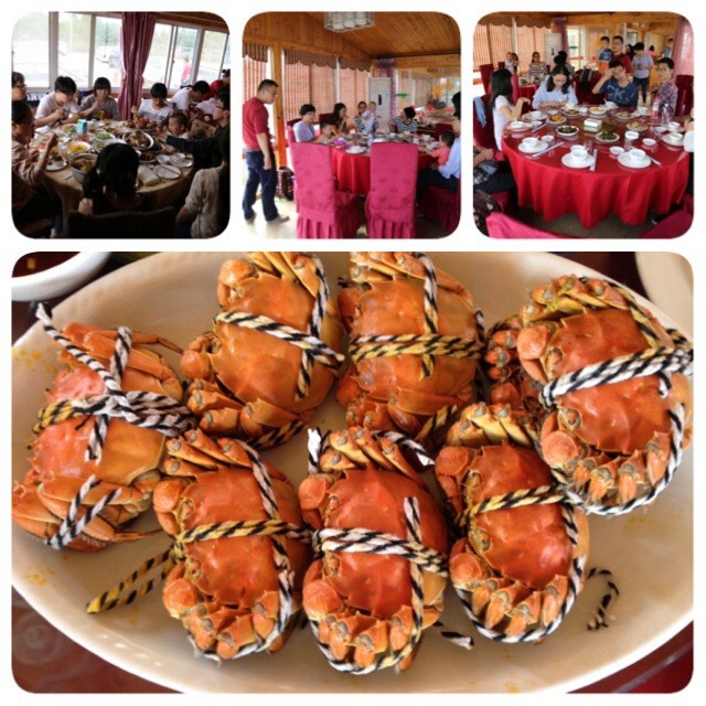 十二點(diǎn)整,午宴正式開(kāi)始,滿桌美味佳肴,香氣迷人。當(dāng)然,大家最期待的還是肉鮮味美的大閘蟹。大閘蟹是一種經(jīng)濟(jì)蟹類,又稱河蟹、毛蟹、清水蟹或螃蟹,為中國(guó)久負(fù)盛名的美食。中國(guó)境內(nèi)廣泛分布于南北沿海各地湖泊,以江蘇陽(yáng)澄湖所產(chǎn)最著名。陽(yáng)澄湖大閘蟹為“蟹中之王”,其色、香、味妙不勝言,“蟹封嫩玉雙雙滿,殼凸紅脂塊塊香”。那橘紅色的蟹黃、白玉似的脂膏、潔白細(xì)嫩的蟹肉,造色、香、味三者之極,更無(wú)一物可之上,也是其它湖區(qū)蟹無(wú)法比擬的,難怪章太炎夫人、湯國(guó)梨女士詩(shī)曰:“不是陽(yáng)澄湖蟹好,此生何必住蘇州”。