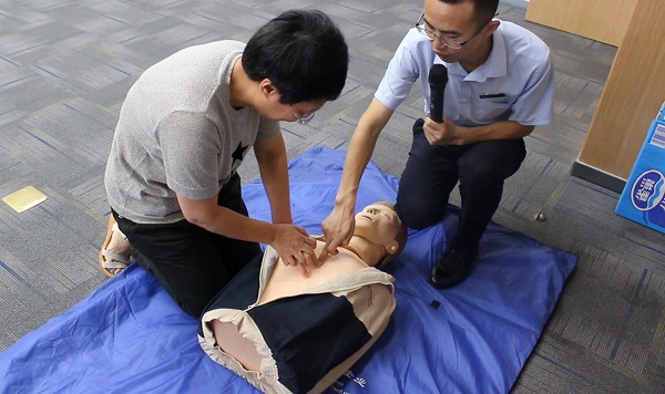 講座中,董老師主要從CPR急救和職業(yè)健康兩方面做了講解。先是CPR急救知識(shí)的講述,緊接著用假人模擬進(jìn)行了心肺復(fù)蘇的按壓演示,在兩個(gè)同事的演示下,大家對(duì)如何做胸外按壓有了很直觀的感受,之后老師又就人工呼吸等急救知識(shí)做了進(jìn)一步講解,讓大家獲益匪淺。